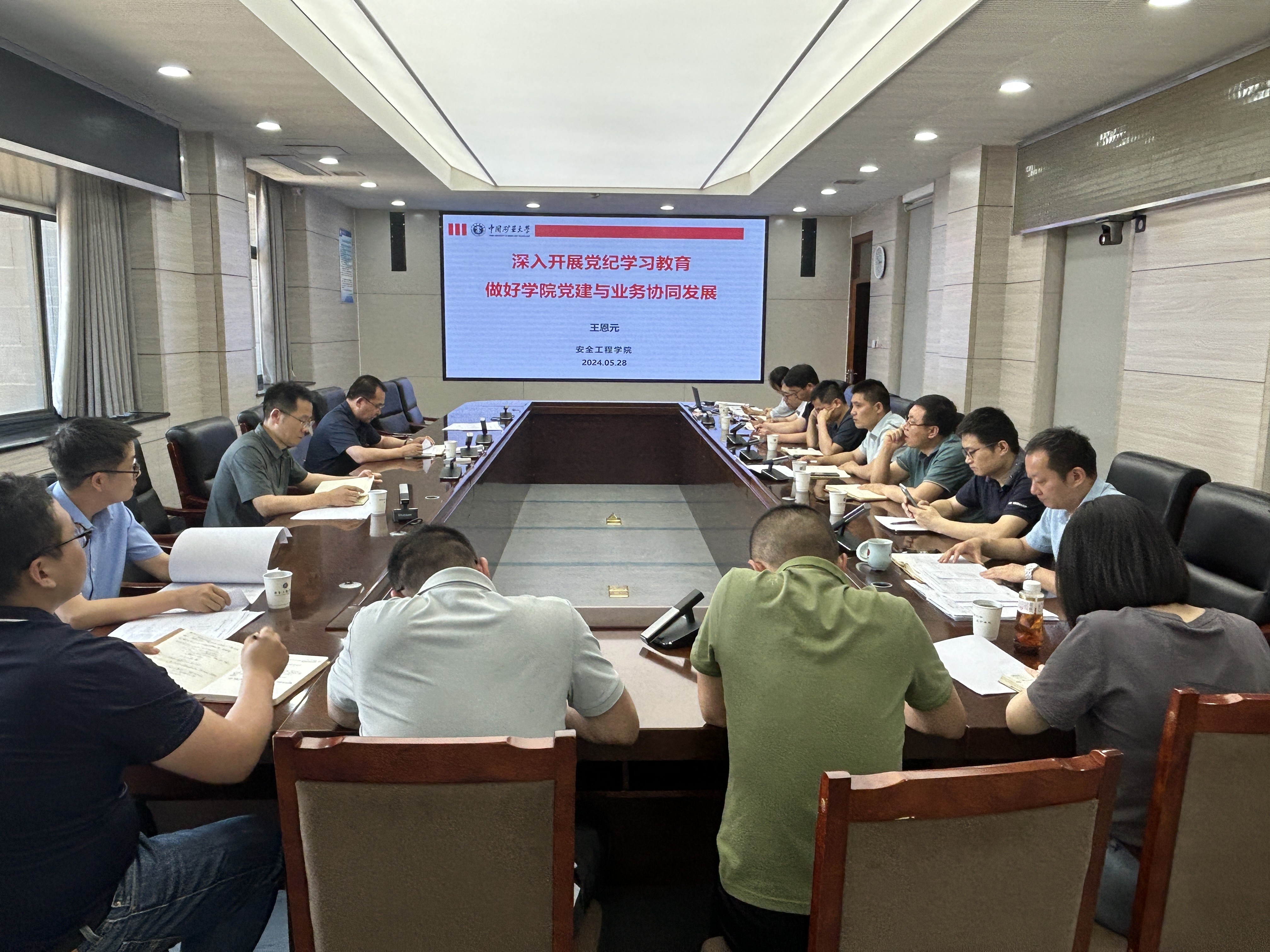 在专题党课上,王恩元以《深入开展党纪学习教育,做好学院党建与业务协同发展》为题,系统梳理了安全学科的总体情况、建设成效、拓新发展、面临挑战及双带头人作用发挥,结合学科建设情况阐述了党建与业务的协同发展。同时,他对党支部建设提出了具体要求,希望党支部加强内涵建设,着力于青年教师发展、教育教学、科学攻关和人才培养,促进学院各项事业高质量发展。