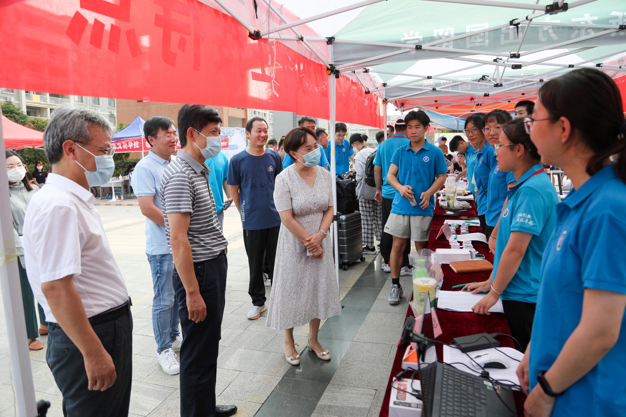 迎新站点慰问志愿者们,并与现场同学进行亲切交流,勉励新生们坚定理想信念,磨练坚强意志,勤于学习,勇于创新,乐于探索,成为学科优秀人才。校党委副书记蔡世华、学工处处长冯震在现场了解了新生报到的相关情况,关心同学们返校后的学习、生活情况。学院党委书记曲颂、党委副书记孙留涛对迎新工作进行现场指导,以保障迎新工作顺利开展。