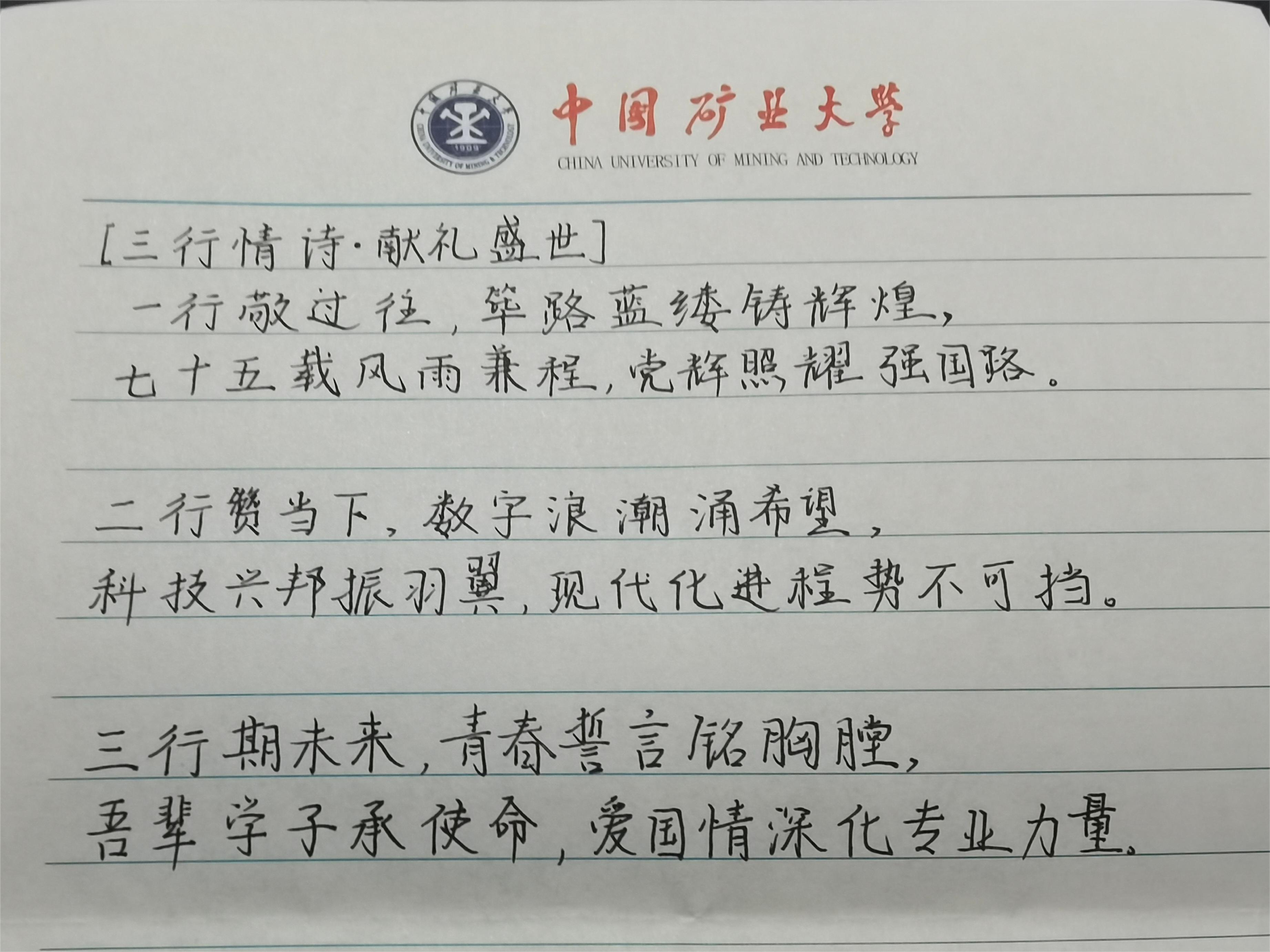活动伊始,学生党员工作站宣传部制作宣传海报,通过线上宣传的方式积极动员同学参加打卡活动。活动期间,同学们积极参与,收集了40余份优秀作品。有的同学歌颂中国共产党团结带领中国人民,书写了中华民族几千年历史上最恢宏的史诗;有的同学将爱国之情比喻成心中熊熊燃烧、永不熄灭的火焰,炽热而明亮;有的同学看到校园万物欣荣,繁花盛开,提笔书写春意盎然;还有的同学立志好学力行,求是创新,争做安全学科一流拔尖创新人才。