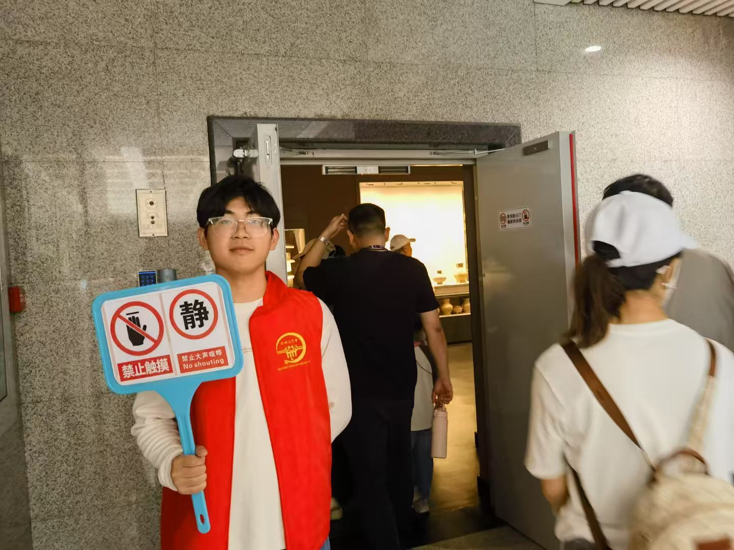 作为徐州历史文化的荟萃之地,徐州博物馆在假期吸引了大量游客。面对如织人流,矿大安全学院的志愿者们提前到岗,迅速投入工作。尽管参观者络绎不绝,工作强度较大,志愿者们始终坚守岗位,以饱满的热情、专业的素养和真诚的态度服务每一位游客。他们不辞辛劳,耐心指引路线、解答疑问,用行动保障了游客良好的参观体验,成为博物馆内一道亮丽的“志愿红”风景线。