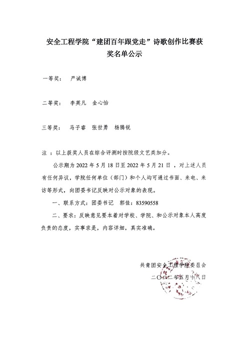 此次活动陶冶了同学们的文学情操,发扬了五四爱国精神,培养了爱国情感,更重要的是在疫情封校的特殊时期激发了安全学子们团结一心,共同抗击新冠疫情的团体精神。