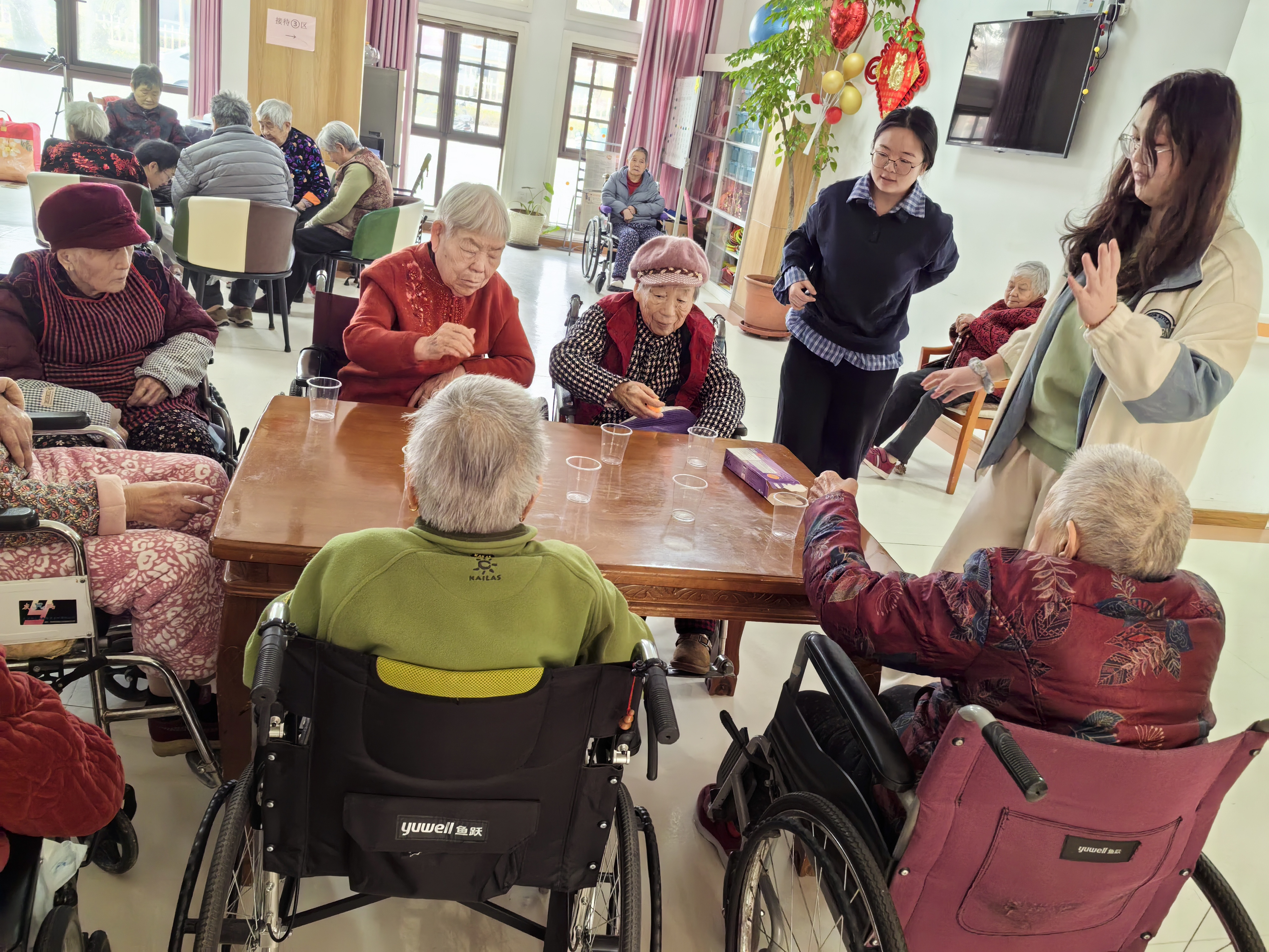 活动伊始,志愿者们首先进行了简短的自我介绍。老人们也因志愿者们的到来,流露出了开心的模样。紧接着,志愿者们分为多组,分头带着老人们进行一些小游戏:将乒乓球掷入一次性纸杯、不同颜色卡纸的快速识别......这些小游戏给老人们带去了欢声笑语。活动最后,志愿者们为老人们献唱了五首经典老歌,用音乐舒缓他们的情绪,抚慰他们的心灵。