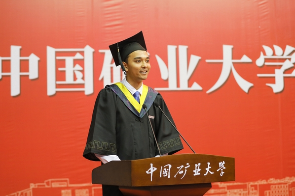 2017级本科生艾克热木江·艾合麦提作为本科生代表进行发言,艾克热木江·艾合麦提同学分享了自己从新疆来到矿大求学的经历,介绍了自己学习安全专业的初衷与使命以及选择加入研究生支教团的感悟。毕业典礼上,也为韩国三级