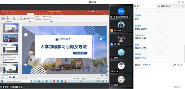 此后,刘世通老师邀请了一些优秀学生进行经验分享,有针对就业方向来自18级杜煊赫同学的分享,有针对高数、物理、Python学习方法来自20级曹蕾、费桢、符亮亮同学的分享,还有针对高数、物理、Python复习方法来自21级杨腾锐、秦东子、董雨晴同学的分享。大家依据各自的经历为同学们提出了针对性的建议及个性化的学习方案,有助于同学们合理制定自身发展规划。卢笛老师从家人、室友、超越自己三个角度对同学们的心理状态表达了关怀并对给予了美好的祝愿。最后,刘世通老师对本次年级大会进行了总结,宣布本次年级大会的圆满结束。