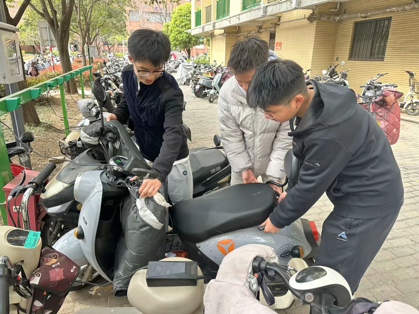 活动当天,后勤管理处安全负责人首先向志愿者讲解了校园非机动车管理规范,强调规范充电对预防火灾的重要性,并结合近期电动车安全事故案例,提醒同学们关注充电桩线路老化、飞线充电等隐患。随后,志愿者分成三组,深入校园各区域开展巡查:在宿舍楼前,志愿者将随意停放的车辆重新归位,张贴"规范停放"标识;在充电桩集中区,逐一检查设备运行状态,清理周边堆放的杂物;针对个别私拉电线充电现象,志愿者拍照记录并上报整改。活动还特别设立"安全监督员",对占道车辆进行劝导,向过往师生发放安全倡议书。经过三小时集中行动,校园主干道及重点区域车辆停放秩序显著改善。