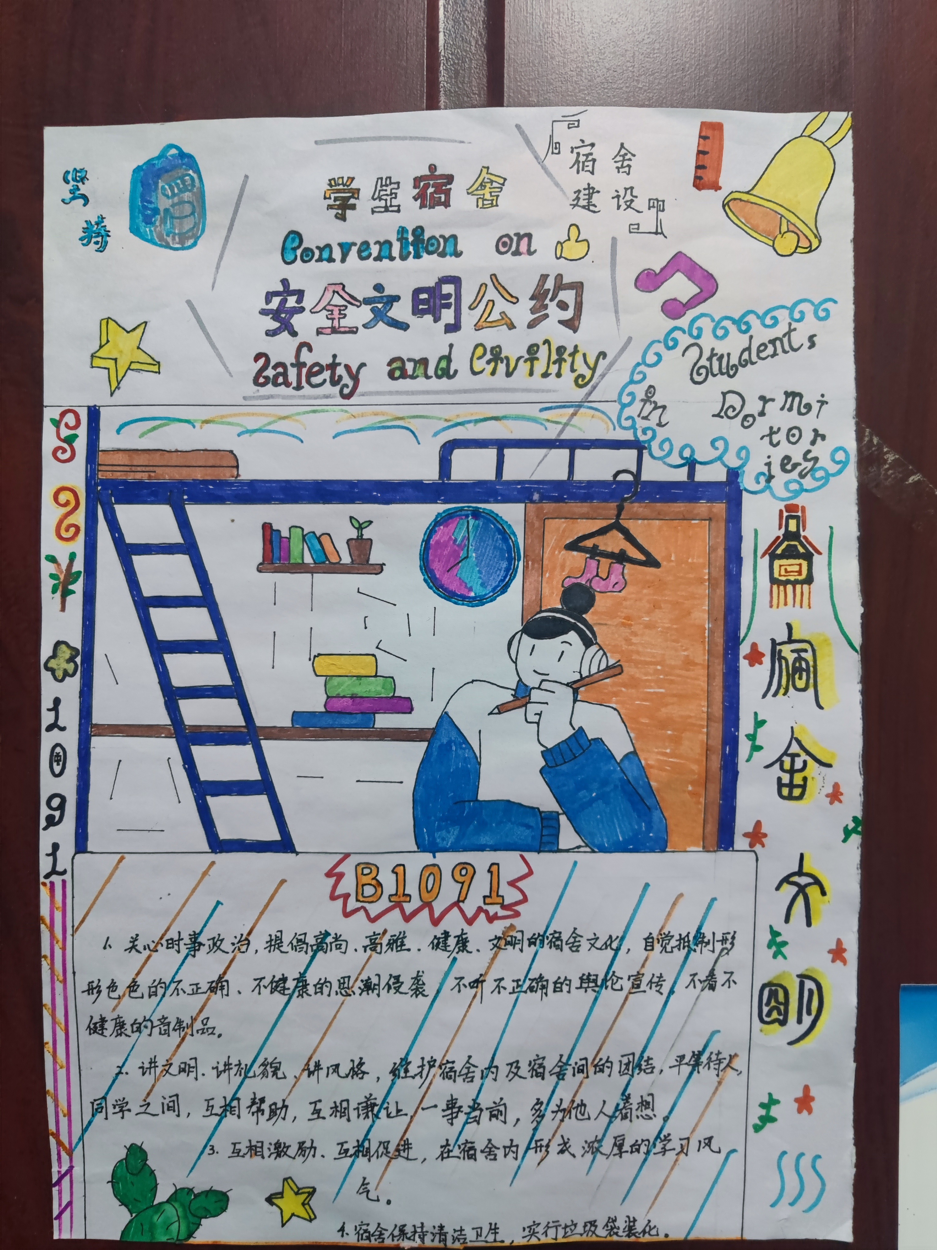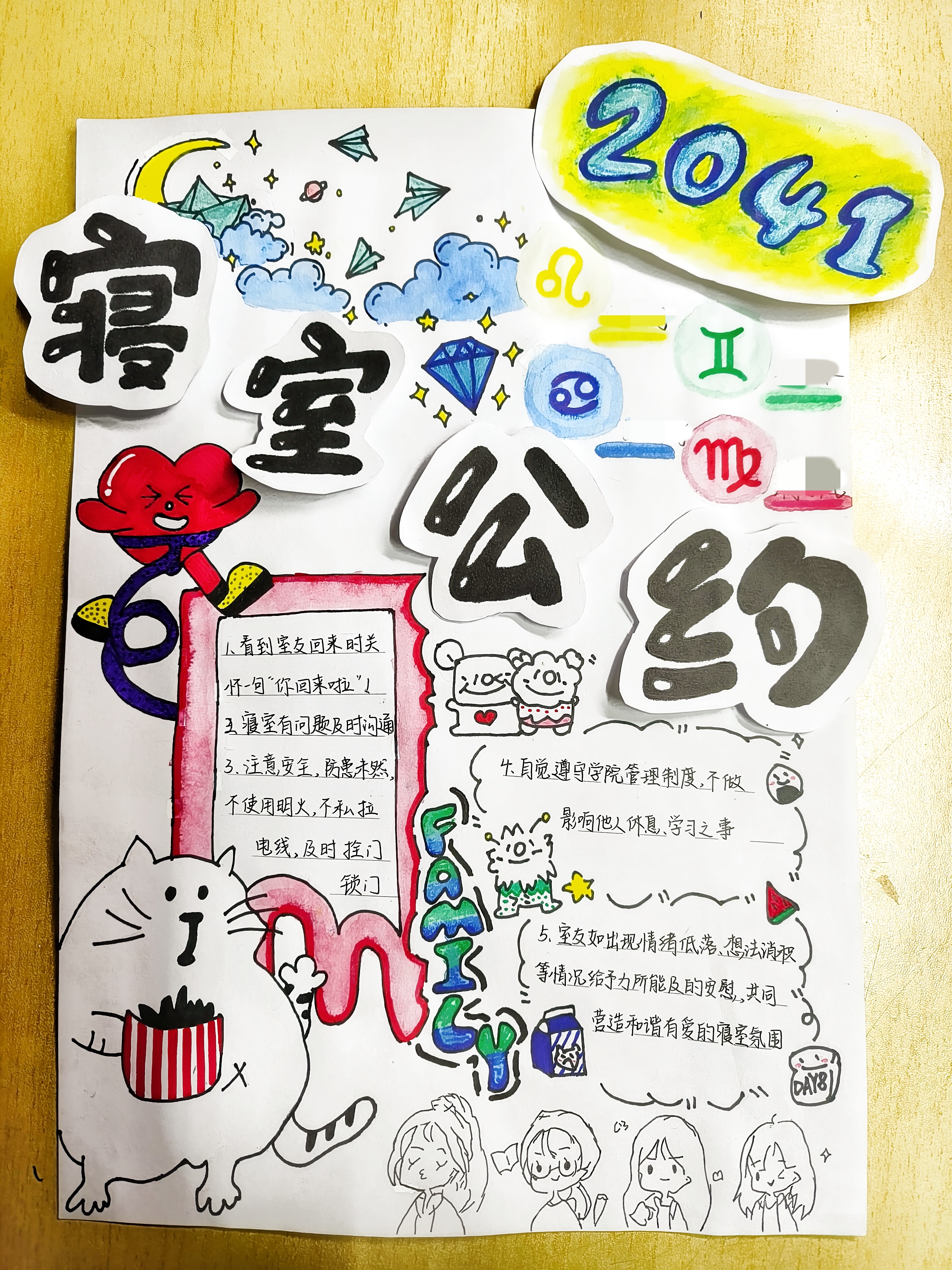此次比赛的主题为“搭建心灵家园,共创和谐宿舍”,主要参赛形式为以寝室为单位绘制手抄报。活动期间,各寝室同学开动脑筋,推陈出新,围绕舍风、学风、安全、卫生、作息、生活习惯等方面,总结出宿舍特有的文化和文明特色,凝练出具有宿舍特点的文明公约内容,并绘制了许多优秀的手抄报作品。比赛作品汇总后,由各年级老师对参赛作品进行了评分,并筛选出前30%作品进行公示。