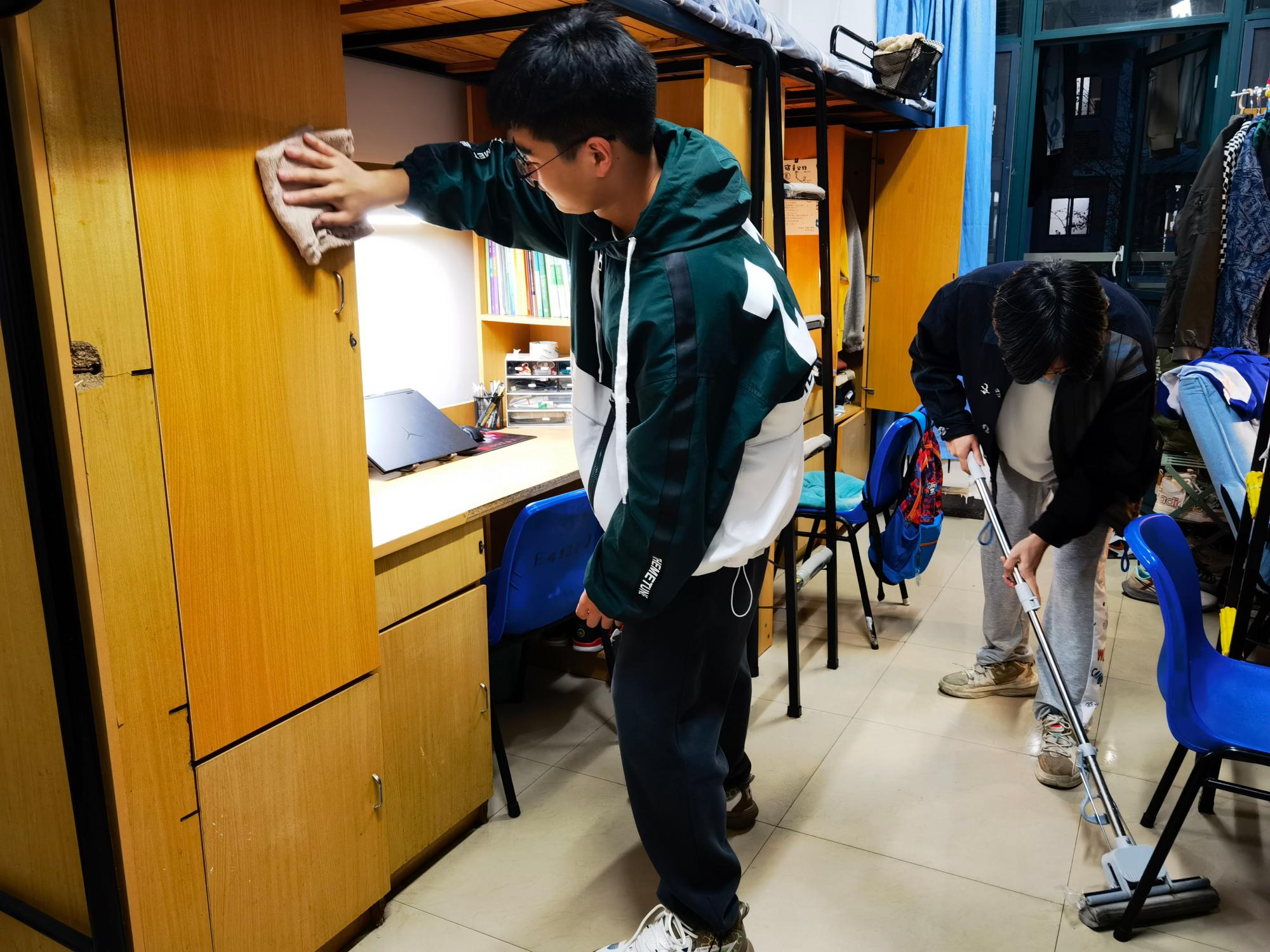 在各年级辅导员带领下,学生党员首先对自己所负责寝室的卫生情况、违禁电器及学习情况、思想状况做了细致认真的了解和登记。刘世通老师向学生党员强调了学生党员在寝室管理方面的责任与义务,并布置了近期寝室的内务卫生打扫、违规电器检查,学习互帮等工作。本次活动以宿舍为单位,学生党员联系宿舍,寝室长带头行动,宿舍成员全员参与的原则,对宿舍进行全面打扫,消灭卫生死角,同时加强宿舍学风建设。检查当天,刘世通老师再次强调卫生检查注意的重点及评分细则,保证评比的公平客观。活动最后,检查员以宿舍卫生为主,宿舍学风为辅进行评分,综合考察宿舍整体风貌。
