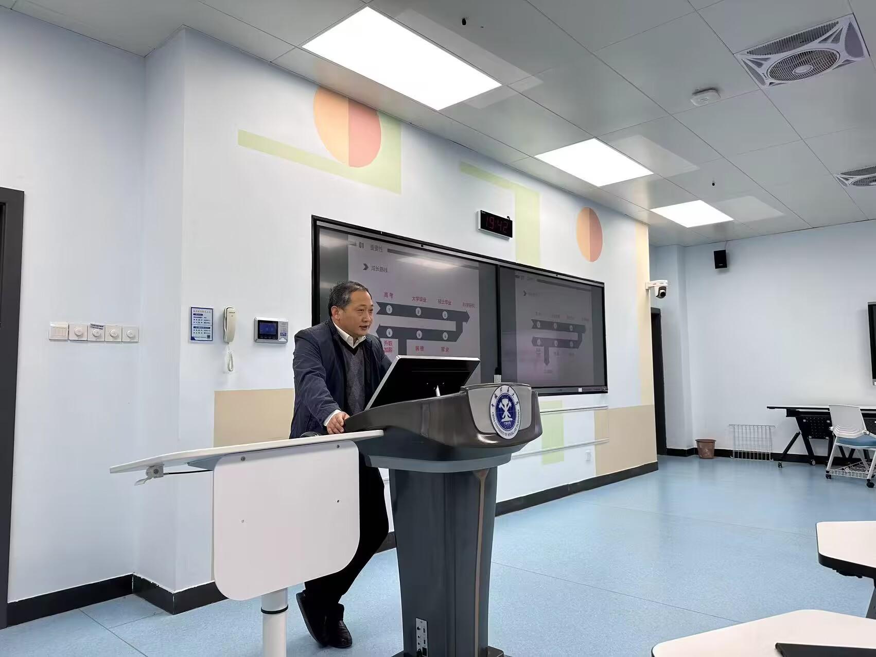 活动伊始,任万兴教授结合自己多年的求学经历和工作经验从人格塑造、能力培养、社会交往等多方面阐述了大一学年的重要性,提醒学生珍惜当下时光,在大一学年认真学习,为以后的专业学习打下基础。接着任教授从多方面讲述养成良好习惯在学习生活的重要性,勉励大家要加强运动提升身体素质,遇到问题积极调节心理健康,增强个人自信等。随后,任教授又对未来规划进行了详细的分析,告诉同学们需要结合自身特点,避免盲从,合理选择升学还是就业。任教授用幽默风趣的方式阐述了新木桶效应的原理和意义,建议同学们要培养自己的兴趣爱好,要扬长避短,彰显个人特色,最后走出一条适合自己的道路。活动最后,任教授与同学们积极进行互动,耐心回答同学们提出的各种问题。