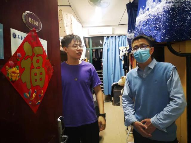 安全19-5班班主任陈栋老师来到梅苑学生宿舍看望安全19-5班的同学们,了解同学们返校后的生活学习情况,亲切的询问每一位同学的困难之处,并为其解答疑惑。勉励同学们好好学习、全面发展。鼓励同学们培养自己的兴趣爱好,争做新时代的好青年!