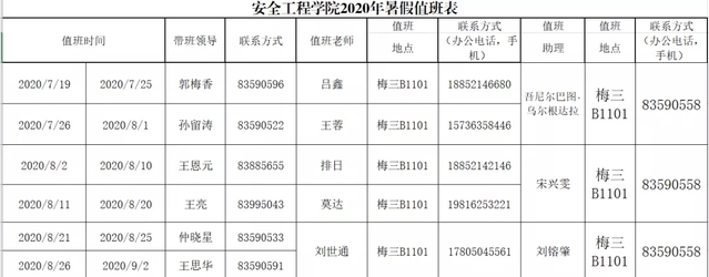 安全学院2020暑假值班表