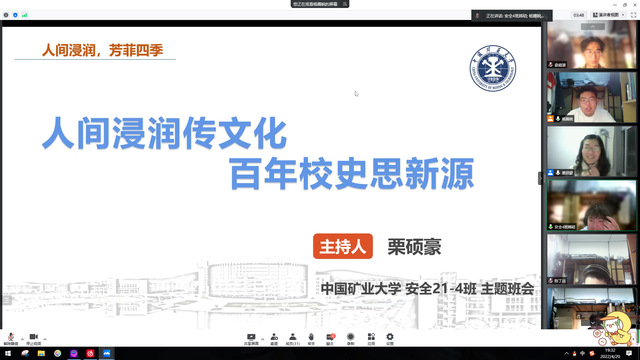 4月20日晚7时,安全学院2021级4班行政班主任及全体同学开展“人文浸润传文化,百年校史思新源”主题线上班会,会议由班主任栗硕豪老师主持召开。