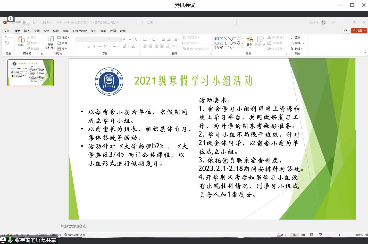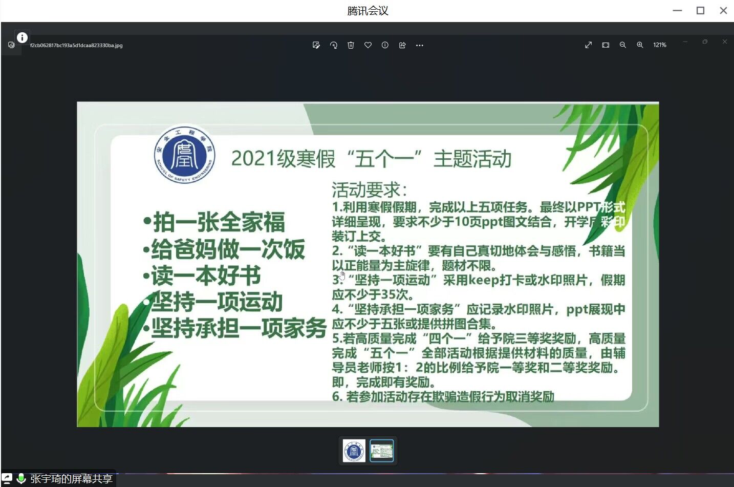 2021级召开线上假期学习动员大会。本次会议由辅导员助理杨腾锐主持,21级辅导员刘世通、卢笛,21级班级负责人以及21级预备党员参加。