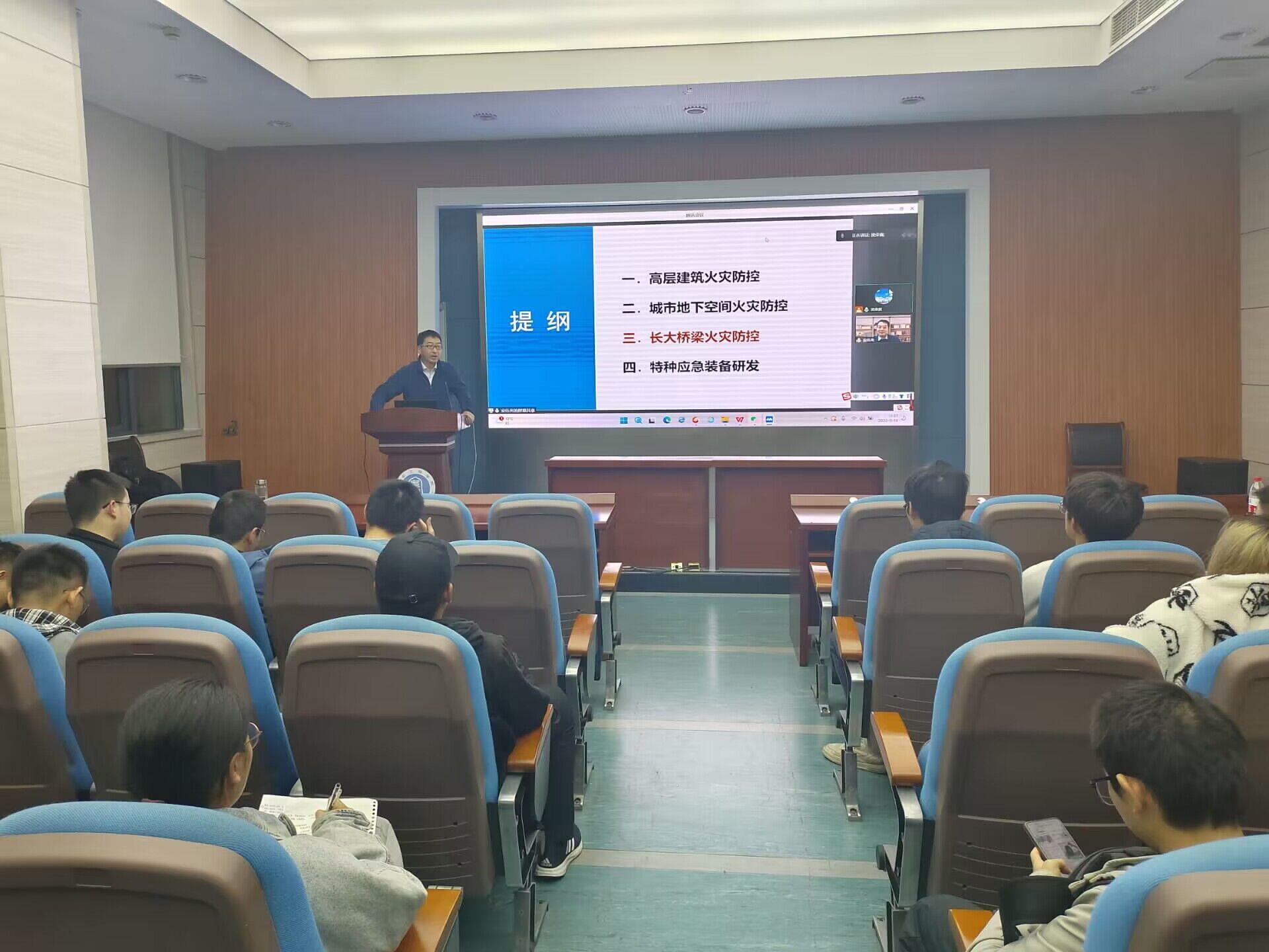 本次“教授有约”活动以“超级工程如何超级安全?”为主题,因安伟光教授在大连理工做访问学者,所以本次活动由安教授远程连线。首先,安教授分别从高层建筑火灾防控和城市地下空间火灾防控两个主题为大家介绍重大基础设施火灾防控及应急装备探索,其次,安教授以项目背景及意义为切入点,结合近年来建筑外立面火灾事故频发,造成各项损失严重,从而说明高层建筑防火研究的重大意义。接下来,安伟光教授结合自身实验探索过程,讲述了他是如何一步步进行研究并开展实验,最后通过不断地总结与尝试得出结果。在介绍完高层建筑火灾防控后,安教授进一步介绍了地下空间火灾防控。他对我国近几年对地下空间的利用给大家做了简单介绍,如地下交通建设,地下图书馆等多种地下建筑在我国这些年陆续普及,由此看出对于城市地下空间火灾防控研究的必要性以及重大价值。在众多城市地下火灾中,安教授以PVC电缆引起的火灾为例,为我们详细阐述了其团队的研究思路,以及在研究过程中所遇到的困难与问题,同时也向我们展示了其科学的研究方法。活动最后,安教授希望我们能够对科学的研究思维产生一定的理解并对大家未来的专业发展提出一定的要求——希望大家能够学好专业课,未来为研究的前线提供源源不断的新鲜血液。