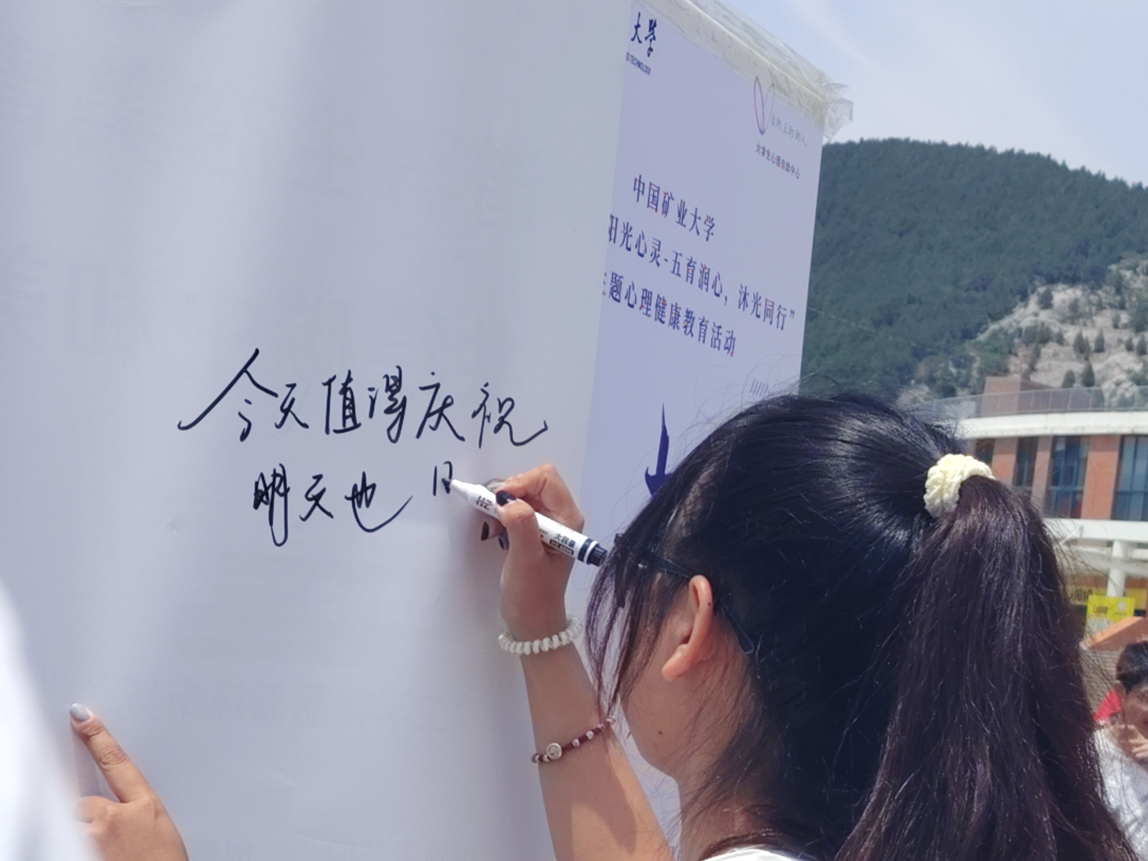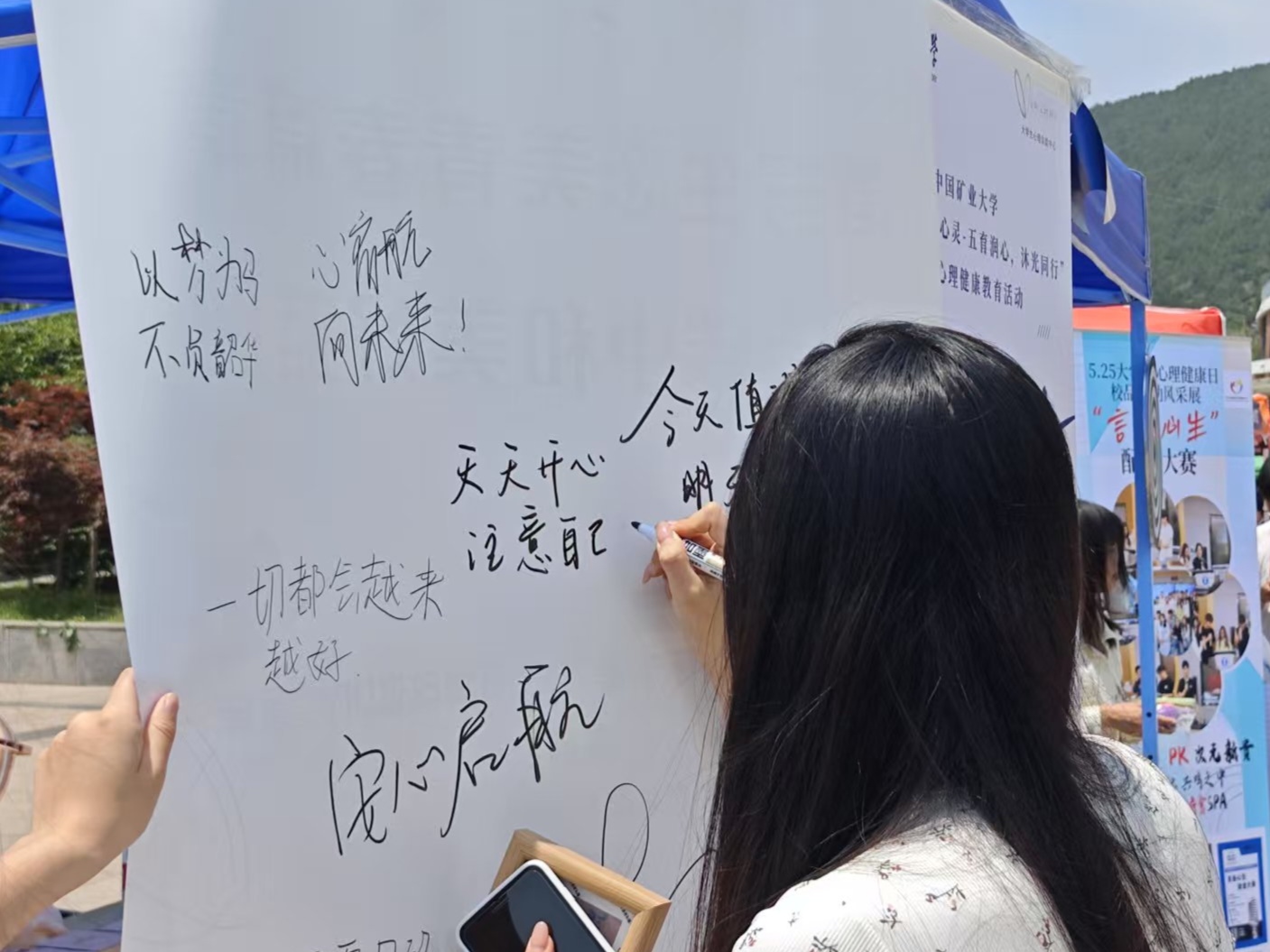 活动现场设置“心语签名墙”与“趣味游戏”两大环节。在“心语签名墙”区域,同学们执笔在白板上写下“今天值得庆祝,明天也是”“加油加油”等真挚话语,将签名墙点缀成一字字的“勇气长廊”。“趣味游戏”分为套圈和投飞镖两个区域,参与者们在其中尽情舒展身体,释放压力,在欢声笑语中赢得了小挂件、解压玩具等奖品。