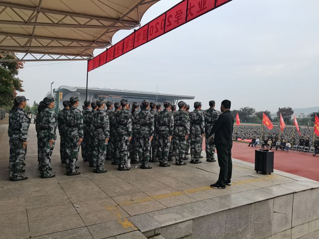 在第二田径场举办2020级新生军训队列会操评比,安全学院2020级辅导员刘世通、兼职辅导员陈劲松和负责安全学院军训的教官带领2020级新生参加本次比赛。