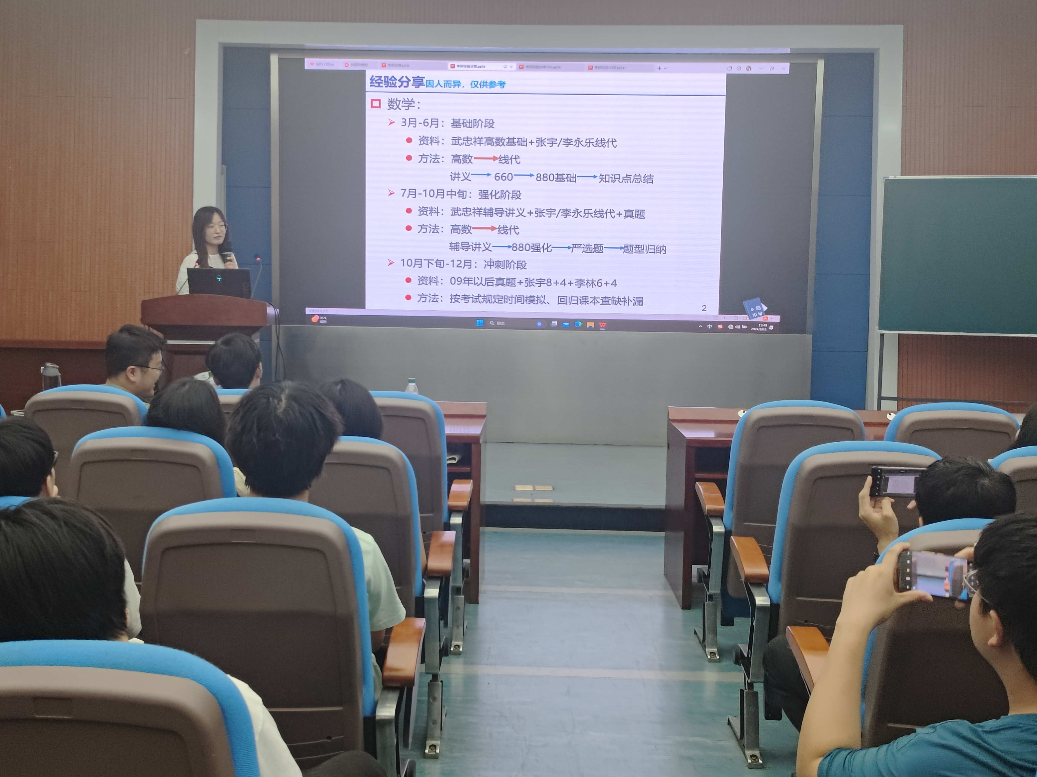 讲座伊始,刘世通老师强调了高效复习的重要性,他分析了当今就业形势与考研形势,呼吁同学们耐的住寂寞,合理利用时间,并督促同学们调整心态,积极备考。随后,已考研至本校的刘宏倡同学向同学们介绍了在考研过程中如何进行自我规划,针对各门考研课程给出了相应建议,向同学们推荐了优质课程并讲解了优质课本的使用方法。紧接着,考研至北京理工大学的范文潇同学继续对数学、英语、政治、专业课程进行了更细致地规划,以及如何平衡日常实习与考研复习进程的冲突,提倡大家要有获得感,才能更好地备考。最后,考研至本校的邢智博同学再一次重申了高效科学的复习方法,强调针对不同科目个性化复习。
