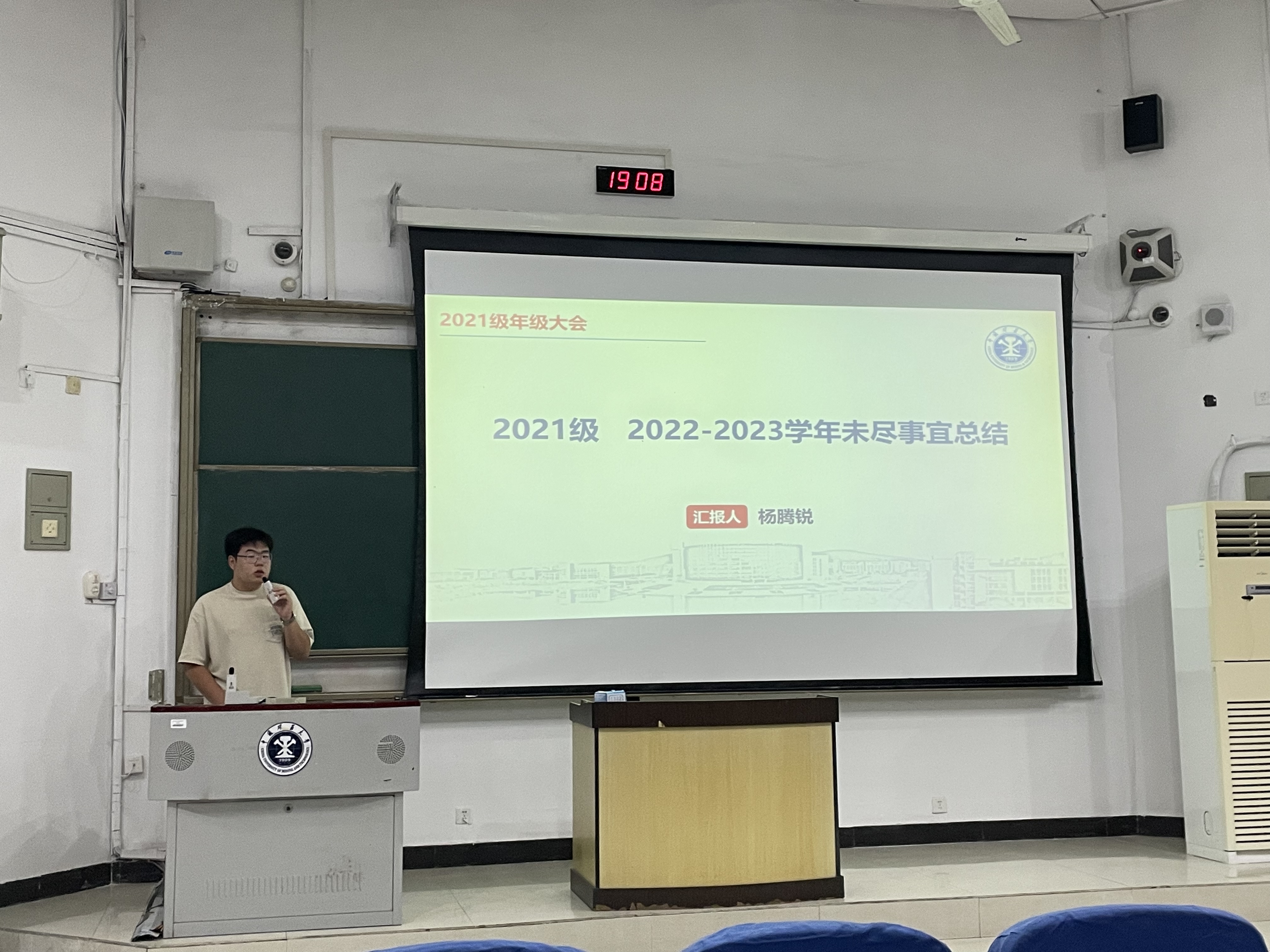 2021级于博二C201召开年级大会。本次会议由辅导员刘世通主持,兼职辅导员唐睿及2021级全体学生参加会议。