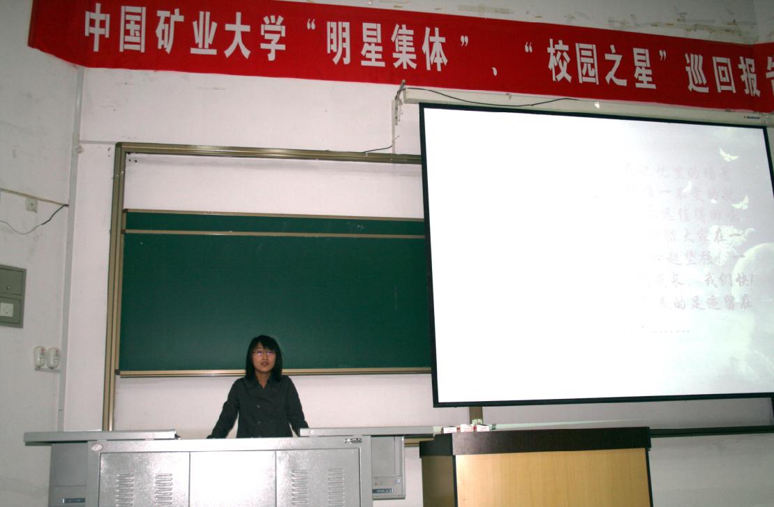 报告会上有六位来自不同学院的同学分别发表了自己对大学生活的感言。他们分别是“明星集体”的负责人―计算机学院计科06-2班的曾希君;“星级宿舍”的负责人―建工学院工程管理07-1班的王艺琛;“学习优秀”之星―理学院数学06-1班的岳晓蕊;“学习科研”之星―矿业学院采矿06-1班的白庆升;“自强不息”之星―安全学院消防06-2班的史波波及“社会活动”之星―管理学院市场营销07-4班的李倩。