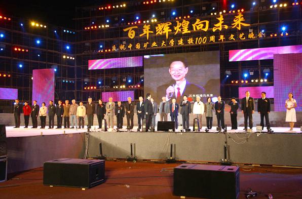 的教师代表出现在晚会舞台上接受学生献花并抒发他们对母校的深厚感情。俞启香教授说道自己自1957年以来,一直从事于矿山安全科学技术方面的教学与科研工作,在学校工作了50多年,在这里度过了最美好最难忘的岁月。王德明院长则说道我们学院的学生拿到过“挑战杯”、“全国优秀博士学位论文”等奖项,希望我们学院的专业以后不仅是全国第一而且是世界第一!
