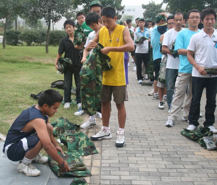 09级新生在团委书记、09级辅导员孙留涛老师以及辅导员陈少松老师和刘筱婕老师的带领下在竹苑3号楼东门前排列着整齐的队伍,领取他们的军训服装。