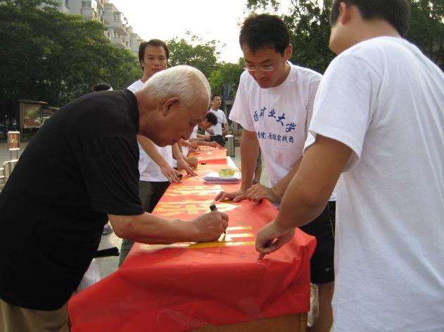 实践团成员们身着统一的白色社会实践服装,分为两批开展活动。第一分队员聚集在小区广场前部,向过往的居民讲述此次活动的内容及意义,并鼓励他们前来签名,就连小朋友都在家长和同学们的帮助下在宣传横幅上歪歪扭扭地签下姓名。而第二分队的队员以中心向各个方向进军,给居民们散发有关如何预防甲型H1N1流感知识的宣传单,同学们还结合自己了解的知识,进行生动的讲解,增强小区居民对于甲型H1N1流感的认知。