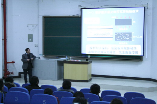 报告会开始,程远平教授在同学们热烈的掌声中走上讲台,他首先从煤与瓦斯突出的背景谈起,以郑州大学煤矿特大型突出引发瓦斯爆炸造成148人死亡为例,向同学们讲述了煤与瓦斯突出灾害的危害性以及煤与瓦斯的突出现状。接着,程教授又具体地讲解“突出煤层开采”、“传统技术途径”、“区域防突措施现行《防突规定》”等与当前煤炭有关的重要问题。对于煤与瓦斯突出问题,程教授与其带领的团队经过十年的精心研究终于找出一套行之有效的措施――“区域防突措施先行,局部防突措施补充,不掘突出头,不采突出面”。经过区域措施效果检验,此项措施不仅降低矿灾发生的可能性,保障煤矿工的生命安全,还促使煤产量迅速增长。