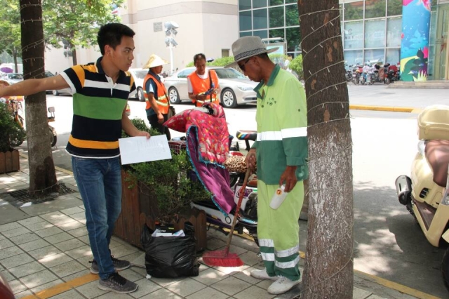 九点整,全体成员于北门集合完毕。他们身着统一服装,拿着印有“实践出真知,知行求合一”标语的队旗,骑车向精英广场和万达广场以及宣武广场进发。首先,队员们加大火力骑行到达精英广场,搭好帐篷,摆好桌椅,做好一系列准备工作。接下来,开始正式的调查。队员们对包括清洁工人、保安等不同的群众进行了详细的咨询。群众们都非常热情地配合,表示对环保十分关注和重视。经过在徐州市多个广场的问卷调查以及环保宣传,队员们收获巨大。最后,星火之队对今天的工作进行了总结交流,并制定和完善了明天的计划。