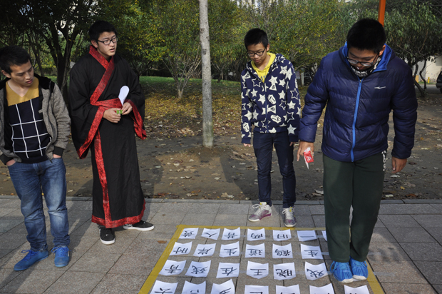 有攻擂自然有守擂,知行社守擂的游戏是“踩报纸”,即猜拳输了的一方需要将脚下的报纸折叠一次再继续游戏,直到站不住脚。一次次迎接其他社团挑战的同时,知行社社长闫天舒带着几个社员们在邻近的邓小平理论研讨会进行游戏互动。在答题环节中,社长以百分之九十的正确率赢得了在场所有人的热烈掌声,纵是理工男,却不乏历史柔情。
