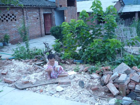 一路上三搭四小组组长刘文栋,热情地给我们介绍柏林镇的相关情况。通过他我们了解到柏林镇共10个村,而洛水村共11个小组,三搭四小组是其中极具代表性的一组。这个小组共82 户人家、297人,其中24户房屋在地震当天就垮了,共75户房屋受损严重,值得庆幸的是只有几人受伤,无人死亡。田地共387亩,其中田197亩,地190亩,而今当地农民自己种田地的已经不多了,当地搞富业的年收入也不过一万多不超过两万一年的收入,近三分之一的农民外出打工,这个小组家有2个小孩子的有10户,其余大多数是独生子女,留守儿童数量也不少,多余的土地以每年500元每亩的价格承包给果蔬种植大户。当地农民农闲的时候也可以在承包地里干点育苗栽种之类活挣点肥料钱。