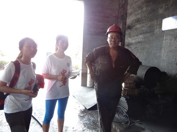 烈日当空,天气闷热。队员们紧紧跟随李书记的脚步,来到在煤炭生产过程中有着举足轻重地位的筛煤区――今天将要采访的工人师傅的工作区。大家一到那里,便看到师傅正站在黑黑的地面上修理机器。他看到我们便赶忙放下工作,热情地与同学们打招呼。师傅穿着的工作服早已被煤灰浸染的失去了原有的样子,带着煤灰的汗水从脸颊上流下来。副队长首先代表团队慰问师傅,师傅笑了笑,将大家带到车间外面,介绍了关于煤的流水线式的生产过程,主要有配煤、筛煤、破碎、选煤、洗煤。接着,副队长向师傅询问矿上是否实现了基本的机械化。师傅骄傲地说:现在我们矿上基本实现机械化,像现在看到的各种大小机械都是由精通技术的人员控制计算机实现的,不再像以前需要工人亲自操作。副队长又继续询问筛煤区现在所做的主要工作。师傅便带领大家进入车间内部,并介绍在筛煤区主要完成的是通过筛煤机将煤和矸石分开,继而煤将流向下一个区的任务。今天的采访结束后,队员们邀请工人师傅拍照留念,但师傅委婉地拒绝了。