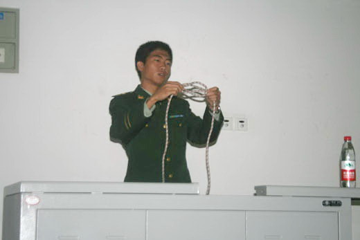 上午8点40,由安全学院青协邀请到的消防战士在热烈的掌声中走进教室,讲座正式开始。讲座的开始,消防战士以俄罗斯和莫斯科友谊大学的宿舍火灾事故为例,给同学们敲响了警钟。随后消防战士又讲述了白天鹅酒店火灾,借此说明国人防火意识的严重缺乏。紧接着,消防战士又介绍了宿舍、教室、礼堂、车站、商场等地的火灾防范和消防须知。在讲座中,消防战士们还现场演示了火灾逃生时双平结和结结的两种打绳结方法,并邀请了一名青年志愿者以及其他两名新生上台表演,亲自授予他们打绳结的方法。