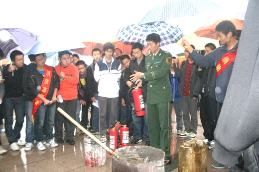 讲座结束后,在安全学院青协志愿者的带领下,新生们到二食堂广场参观了消防器材。参观的同时,消防战士们在一旁为同学们一一讲解。在消防战士们的指导下,新生们成功地掌握了干粉灭火器的使用。现场同学表现活跃,不断有人上台表演,整个灭火演练过程井然有序地进行。