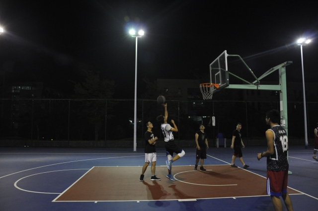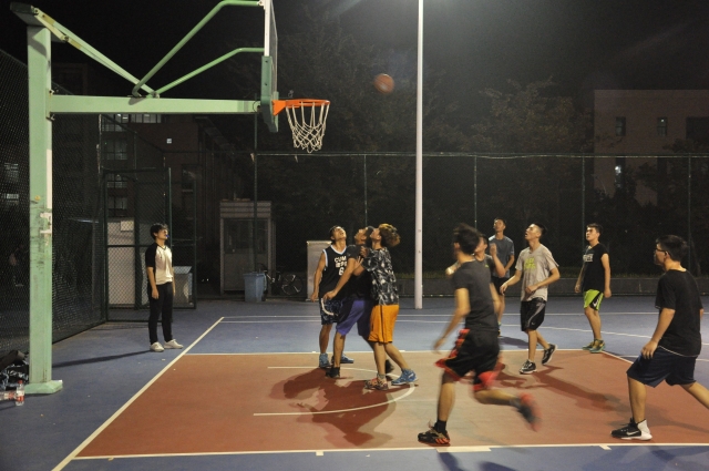 晚上七点十五分,比赛正式开始。一开始,数学学院队取得跳球先机,抢先拿下第一球。安全学院队也不甘示弱,回以一记快攻。第一小节在你来我往的试探中结束,安全学院以14:10的成绩稍稍领先。从第二节开始安全学院队便展开了迅猛的攻势,迫使对手使用保守打法,完全带起了比赛的节奏,一个个球都接连投进。最后上半场以28:14的成绩结束。