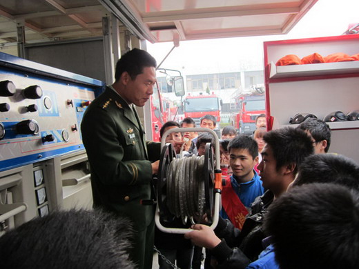下午2时15分左右,在团委副书记李念泽的带领下,所有人员到达消防支队,消防支队的孙队长负责接见并向同学们讲解有关消防的知识。所有人员列队跟随孙队长进行参观,同学们首先参观的是消防车,包括移动式充气车、水罐消防车和泡沫水罐消防车等。随后,孙队长又带领同学们参观了消防设备,让同学们亲眼见到了穿梭在火场中的消防战士们的全身装备,个别同学兴致勃勃的亲自穿上消防队服过了一把消防员瘾。之后,同学们由孙队长带领着参观了消防部队的宿舍,整洁干净的宿舍和方方正正的被子让同学们不时发出一阵阵赞叹,在此期间,孙队长时不时的举出实际案例,强调消防安全的重要性,并建议同学们不要死读书,要学会对书本知识的应用与变通。