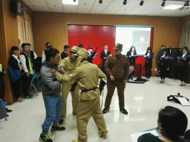 下午1点20分左右,安全学院表演者们开始登台表演《站立的中国人》话剧。演出人物分2组:分朗诵组和表演组,朗诵组朗诵在外国女老板欺压中国工人背景下的诗歌《中国人,不跪的人》。表演组结合诗歌内容,展开了主人公因一场梦境回到那个年代的一系列演绎。话剧第一幕,主人公沉醉于电子游戏,对身边生病的同学漠不关心。随后 瞌睡进入了一场梦景,经历了一段战火硝烟的抗战历史,梦境中表演组表演的中国人被无辜旳欺压,残杀直到抗战胜利,期间当朗诵组振臂高呼:我们中国人是顶天立地的人!我们中国人,是不跪的人……主人公被惊醒,回到现实。他深刻地意识到自己颓废与之前蹉跎岁月的悔恨。最后,表演者们一起高呼: 我们--对谁对谁也不下跪 ;我们--永远,永远也不下跪!惟妙惟肖的表演和激昂慷慨的朗诵深深地震撼了评委和观众们,屡屡获赞。