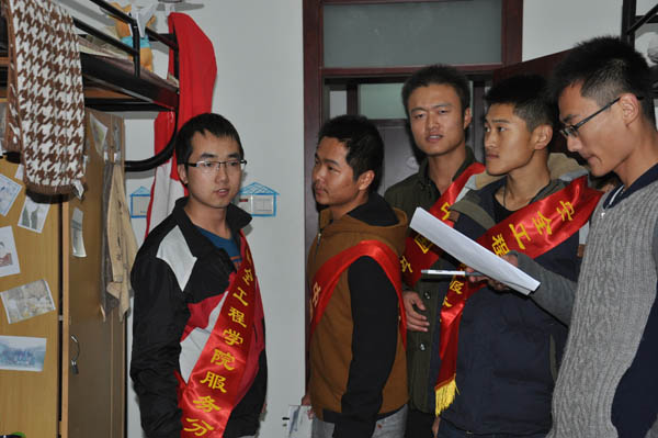 服务分队队员在队长齐世铭的带领下准时到达集合地点,并整齐戴上了绶带。为了检查工作的顺利进行分队队员都带上了绥带,晚上十点整,宿舍卫生检查活动正式开始。首先检查的是梅三的13级宿舍。在检查过程中队员们分工合作,有条不紊的对宿舍各个角落进行细致认真的检查并对每个宿舍进行评级,同时宿舍人员也积极配合检查活动,认真听取检查意见。而在对14级学生宿舍检查中,也许是初到学校并不太懂怎样整理宿舍,部分宿舍存在着物品摆放不起,地面较脏等一些问题。总的来说,梅三宿舍卫生总体上达到学院标准。同时,梅一宿舍也都做到了地面整洁,物品摆放整齐。