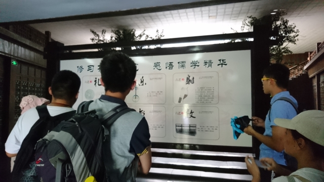 今日,成员整装待发,前往曲阜六艺城体验六艺文化。在这里,成员了解到六艺分为礼、乐、射、御、书、数。初入六艺城,巨大的礼阵让队员感到震撼。单看细节,不觉神奇,但整体观之方觉奇妙。其后,队员在导游带领下依次浏览书房和礼义等景点。之后成员体验了孔子周游列国。