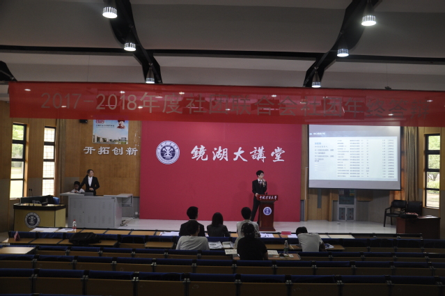 6月9日,2017-2018年度社团联合会社团年终答辩大会在镜湖大讲堂举行。社联主席兼理论社团分主席白向芳,副主席张博贤和潘天宇出席本次答辩大会。安全学院知行社社长张宏伟,社员叶子靖到场参与答辩。