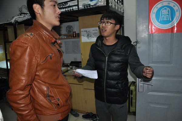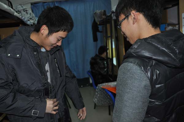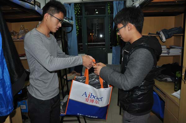 晚九点三十分,安全学院青协分管主席刘碧首先带领部员到梅苑三号楼,为接受补助的同学们发放衣物。领取寒衣的同学有序地在楼道排队领取,刘碧主席亲手将寒衣递交到学生手中,并让学生当场试穿看是否合身,刘碧主席首先向新生了解了近期的生活状况,并且提醒同学们在日常生活中要注意保暖。接着,刘碧主席鼓励大家在大学中努力学习,在接受寒衣补助的同时不要忘记感恩社会,回报社会。接受资助的同学脸上洋溢着灿烂的笑容,等试穿完衣物后,他们向学校以及资助方表示感谢。然后刘碧又分别到梅一和竹苑发放男女生衣物,并确保每个人衣物能够合身。