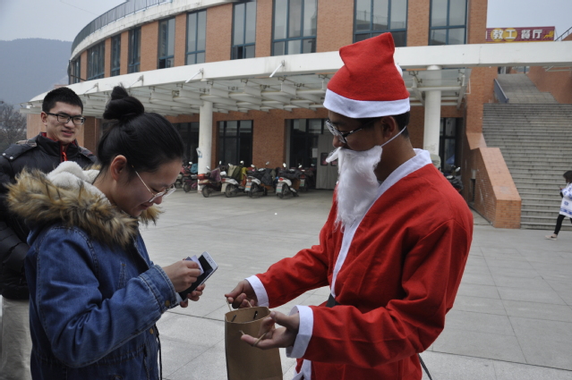 中午十二点,安全学院服务分队的工作人员早早就在活动现场设置募捐箱,以便于同学们献出爱心。服务分队成员们积极为活动作出宣传,工作人员穿戴圣诞老人套装,为过往的同学介绍活动的形式、内容以及意义,吸引了许多热心、富有爱心的同学参与捐赠。本次活动准备了丰富的圣诞礼物,包括学生们的祝愿贺卡、圣诞帽和礼品盒等。当同学们捐赠后,还获得了精美的小礼品。