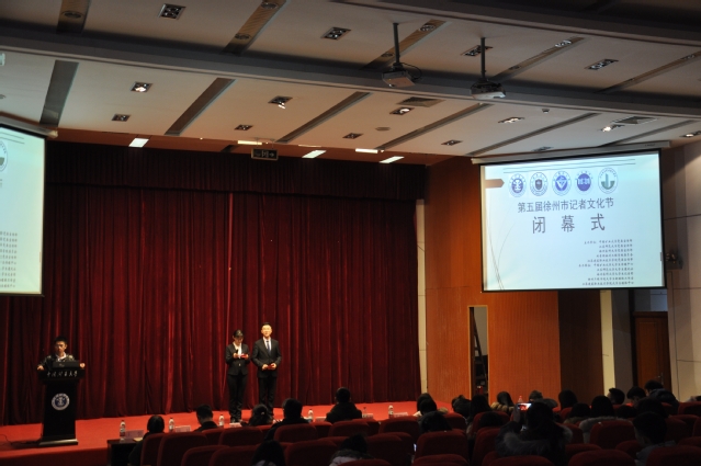 下午2:30,闭幕式正式开始。主持人进行开场致辞,对这一个多月各校进行的记者文化节活动做了一个简单的总结,随后宣布记者风采大赛决赛正式开始。决赛由来自各个高校的九组队伍出赛,分为“团队风采”、“推陈出新”、“新闻知识竞答”、“还原新闻现场”四个环节。整场比赛上,各参赛队伍紧张激烈的角逐着,利用自己的新闻知识和文学积累完美的诠释了作为一个“新闻人”的素养。比赛结束后,各高校的校媒主席对参赛队伍们的表现作出评价和指点,并为优秀参赛队伍颁奖。闭幕式的最后由第五届徐州市记者文化节负责人、韩国三级