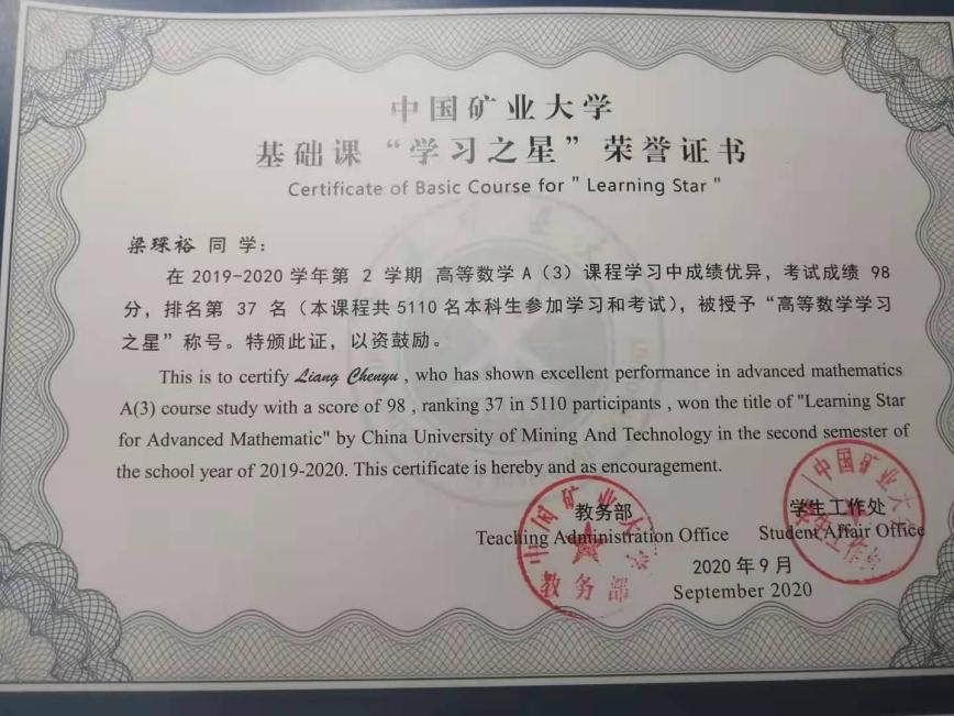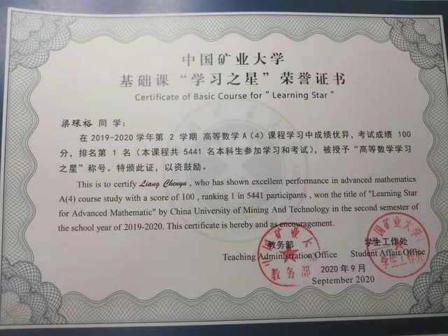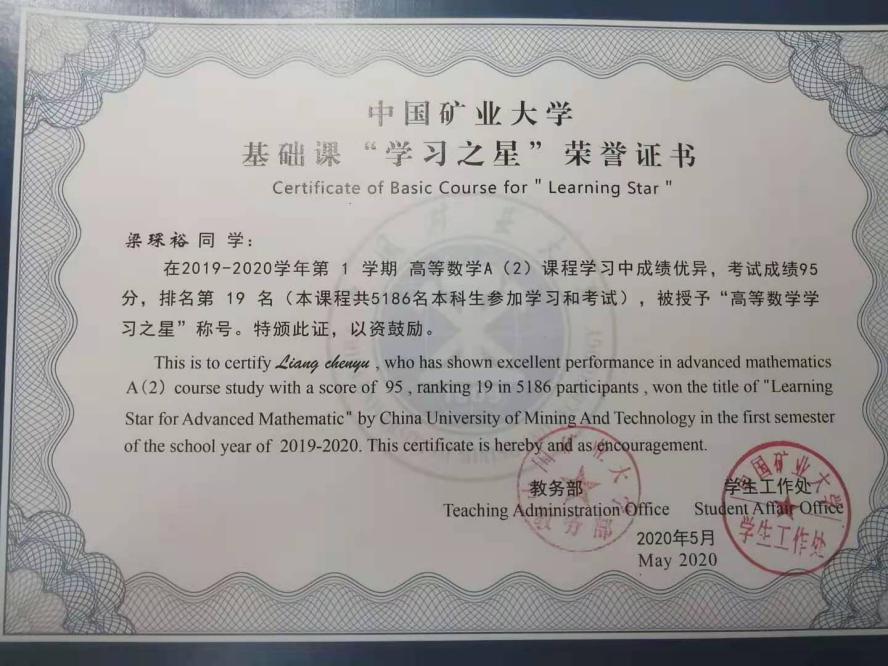 高数基础课学习之星,已通过英语四级、以良好成绩通过计算机二级考试。大学这一年,我自强不息,积极进取,获得了韩国三级