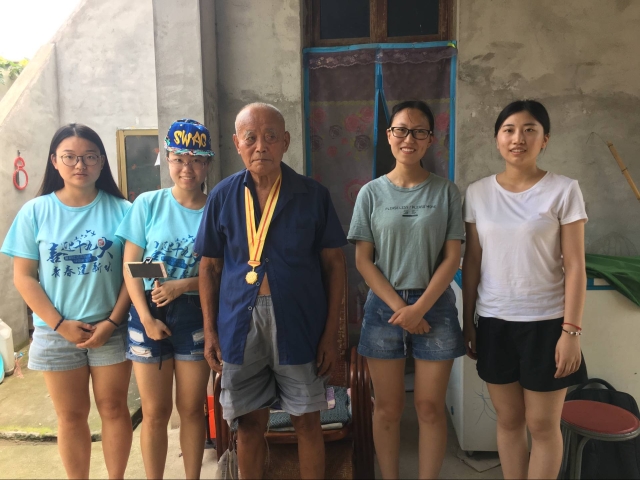 下午三时许,志愿者到达赵增年老前辈的家中。老前辈今年已有94岁高龄,于1939年入伍,当时的他仅有14岁。老前辈因为家里穷,吃不上饭,所以选择入伍,他所在部队是四师九旅二十七团三营九连邳南大队,刚开始他是步兵,后来成为骑兵,在二大队二排七班当班长,最后在三纵队二十三军六十九师炮兵团。回忆起战争,老前辈说道:“打日本就是在睢宁魏集打鬼子,日本来了援兵,就我们二十七团给他包围住了,在那打了七天,他们做的是一个圩子,他们住在圩子里,我们在圩子外面,给他困了有七天,他这里无粮草,外无救兵,没有办法,最后他们就投降了。”赵老前辈参加过多场战役,淮海战役、安徽黄集的战役以及后来的抗美援朝。老前辈于1941年入党,成为一名正式党员,1953年从抗美援朝战争回来。采访结束,老前辈向志愿者展示自己的纪念章和抗战的照片并与志愿者亲切合影。