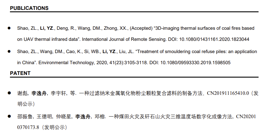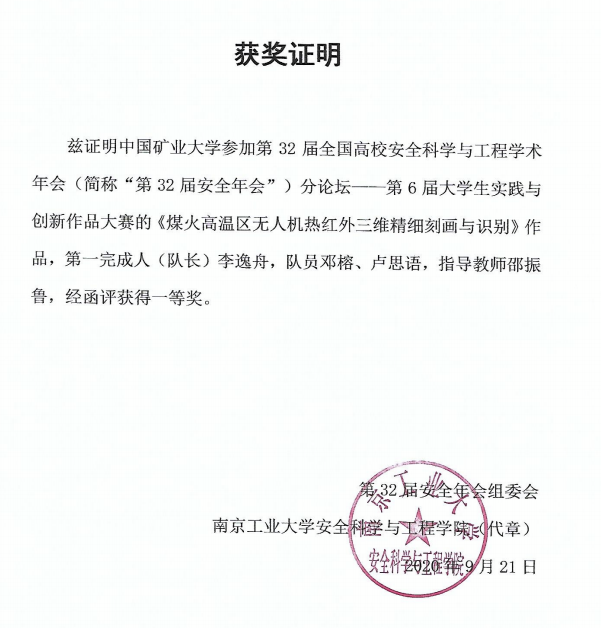 印象最深的是去山西朔州的安家岭露天煤矿,在零下15度的天气里,去现场采集无人机数据,太冷了。”李逸舟提及他曾经的现场工程经验,感叹连连。也许只有化知识为薪,燃起熊熊火焰,才能在那样的寒冬里暖化他的血液,将一腔热血筑成他心目中理想科研的模样。2019年年底,他厚积薄发,利用多地收集的数据和实验室里服务器跑出来的结果,发表了SCI论文一篇,申请了国家发明专利两项,并用该项科研成果参与多项创新创业赛事,最终于2020年获得了第六届安全科学实践与创新作品大赛国赛一等奖的荣誉。