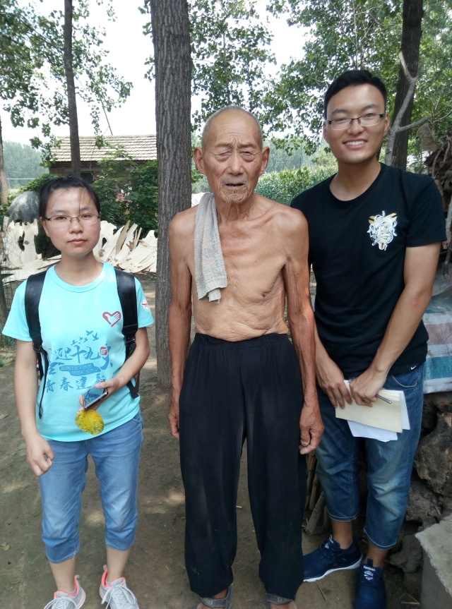 上午九时许,志愿者到达高存甫老前辈的家中。高老前辈于1943年入伍,当时的他仅有15岁,他的家中没有兄弟姐妹,仅他一人。谈到印象最深刻的战役,老前辈说道:“打双沟南面时我在场,那时候是夜里,当时共产党没有电话,就靠石灰在地上标记,横竖着看,就了解共产党部队行进方向,路线都没有。在双沟打开了南门,就从那进入,二鬼子回来的话就从东门到西门,从西门到东门,一路上一有敌人就阻截围杀,来回杀,什么时候杀完什么时候算完 。45年,打马集的时候和我一个大队的有个姓许的营长,还有姓陈的团长,三个营打的,夜里打的。46年就东撤了,来回3年,共产党回来的快,但是装备不行,什么都缺。”老前辈的父亲也是抗日队伍中的一员,且在打仗时负伤,他便接了父亲的班,退伍以后便在县里的警卫连的便衣队。采访结束,高老前辈同志愿者合影。