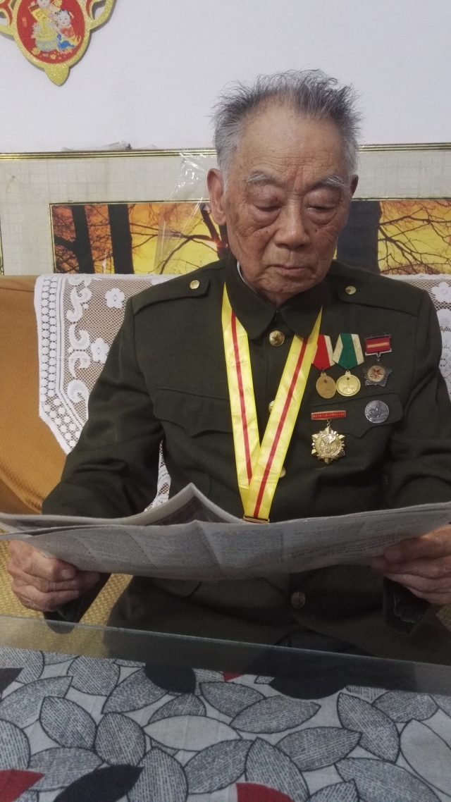 上午九时许,志愿者们来到于占伟老前辈的家中,得知志愿者们来采访抗战事迹,他说:“每次回忆起战火硝烟的年代,我心里既难过又高兴。”于老前辈今年87岁,仍思路清晰,身体硬朗,他随后讲述了自己从参军到抗战的人生经历。于老前辈老家在安徽泗县,家里是上中农,并不算穷,但也经常受地主压迫。父亲没有兄弟,老是受别人欺负,再加上看到日军到处屠杀,当年只有14岁的他听说村里有个当兵的,便想着一起去“闹革命”。于老当时参加的是区大队,条件极其艰苦,不发衣服,连鞋子都没有,站岗、打仗都是赤着。当兵第三天,日军派70多名伪军到城南大李庄抢粮,部队前去阻止发生激烈战斗。于占伟也上了战场,当时的他因为年幼还有些许害怕,但看到战友们英勇奋战,他备受鼓舞。回忆起最艰苦的时期,于老前辈现在仍记忆犹新,他说:“当年日伪军兵分五路,派出骑兵、坦克、飞机、汽船等精锐部队对淮北抗日根据地进行大‘扫荡’,企图消灭我军主力,当时条件特别艰苦,冬季寒冷,吃了上顿没下顿,白天黑夜行军,手脚都冻得长满冻疮,困了就在路边休息一会,起来接着走。一夜换几个地方,稻草就是我们的床,但我军战士浴血奋战,不怕牺牲,历经33天,我军获得反扫荡全部胜利。”后来,于老因为念过私塾,被派去卫校学医。学医归来,于老来到淮北第六医疗队成了一名军医,在前线救护所救治伤员,人手少的时候就上战场杀敌。新中国成立之后,他获得了纪念抗日战争胜利独立自由奖章和抗战胜利60周年勋章。时至今日,于老前辈也不忘抗战,他时常到社区参加公益活动,给大家讲述抗战历史,让更多人知道那段难忘的岁月。采访结束后,于占伟老前辈向志愿者们展示了自己的勋章,并与志愿者们亲切合影。