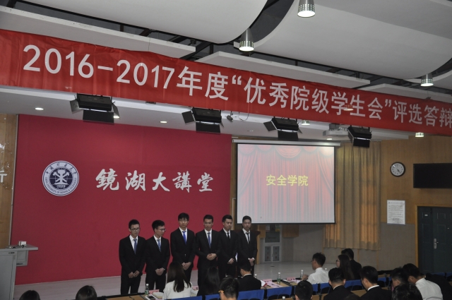 安全学院于第16位出场答辩,由安全学院学生会主席武文杰进行答辩。武文杰回顾了这一年来安全学院学生会所取得的成绩,向各位评委展示了安全学生会风采,并探讨了安全学院在传承安全优良传统活动中推陈出新,加强内部建设,外巩工作作风。最后,武文杰谈到了对未来的展望,要紧抓机遇。随后,面对主席团的提问,安全代表成员从容应答,顺利的完成提问。最终,经过半小时的统计评选出一系列院级优秀学生团委奖项。由主持人公布评比结果,各领导进行相应颁奖。最后,各学院主席团进行合影留念,主持人宣告此次答辩顺利完成,各学院有序离场。