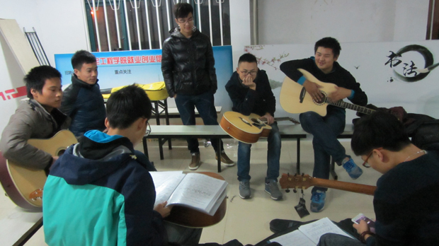 晚上九点整,指导老师徐毅斌带领同学们来到活动室,每位同学都背着一把吉他,看起来颇具有音乐狂热分子的气质。首先老师为每一位同学的吉他进行了校音并为同学们弹奏了一首轻快的小曲,使现场气氛随即变得愉悦起来,同学们也伴随着节奏哼出了小曲。随后,老师为同学们演示了几种弹奏的基本方法,如基本的指法,扫弦,勾弦等。同学们都兴趣盎然,听得专心致志。然后,老师为了让大家了解到吉他蕴含的音乐韵味,决定和同学们边唱边弹。老师拿出两本厚厚的吉他谱,挥手示意同学们上前选曲,来自安全一班的同学显得格外积极,全都围着吉他谱兴致勃勃地选曲。在弹唱过程中,每位同学的脸上都透露着快乐的表情,沉浸在音乐艺术中。随后,老师也介绍了几种比较流行的吉他款式,分别从吉他的选材,制作方式,音色效果,外表外观进行知识的普及,解决了刚开始学习吉他的新手的各种知识困惑。最后,团长褚天魏为整个课程做出了总结,并安排了下次课的时间和地点。