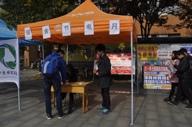 宿舍楼是学生活动最频繁、用电量最为集中的区域,因此举办此活动,通过统计报名大寝一个月内的用电信息,按人均用电量排名,选出节电宿舍。中午12:30,三食堂门口人头攒动。同学们看到“宿舍节电月”宣传棚便前来了解情况,并纷纷表露出对此活动的兴趣。安全学院生活部的成员们拿着宣传单,细心给路过的人们讲解活动细节,鼓励大家积极报名参加,并现场填写宿舍信息。在鼓励参与的同时,生活部的同学们还提供了一些节电小常识,呼吁大家从校园点滴做起,养成节电的习惯,为保护环境尽自己的一份力。