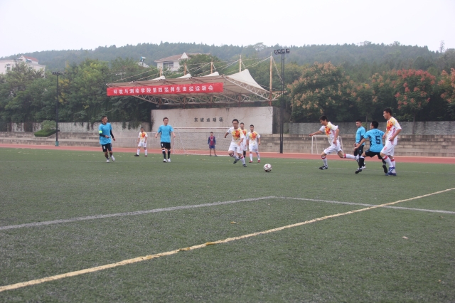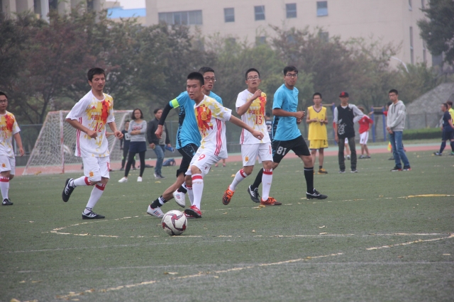 此次比赛由安全学院对战资源学院。比赛开始前,双方队员在场上积极进行热身训练,颠球、传球、踢球。12点30分,比赛准时开始。双方默契地采取了试探性进攻,以便摸清对方的攻防套路。安全队和资源队你来我往,互有攻防,赛事甚是激烈。资源队球员攻势猛烈,安全队的门将防守严密。上半场结束,安全学院暂时落后。中场休息时,安全学院新生队领队周彤对上半场的形式进行了分析,总结了安全队的不足,提出了下半场的改进意见。下半场开始,在明显的劣势下,安全队并没有气馁。在资源队快速猛烈的进攻节奏中,他们多次中截对方的传球、射门,踢出了安全队的气势。最后,安全学院遗憾败给了资源学院。